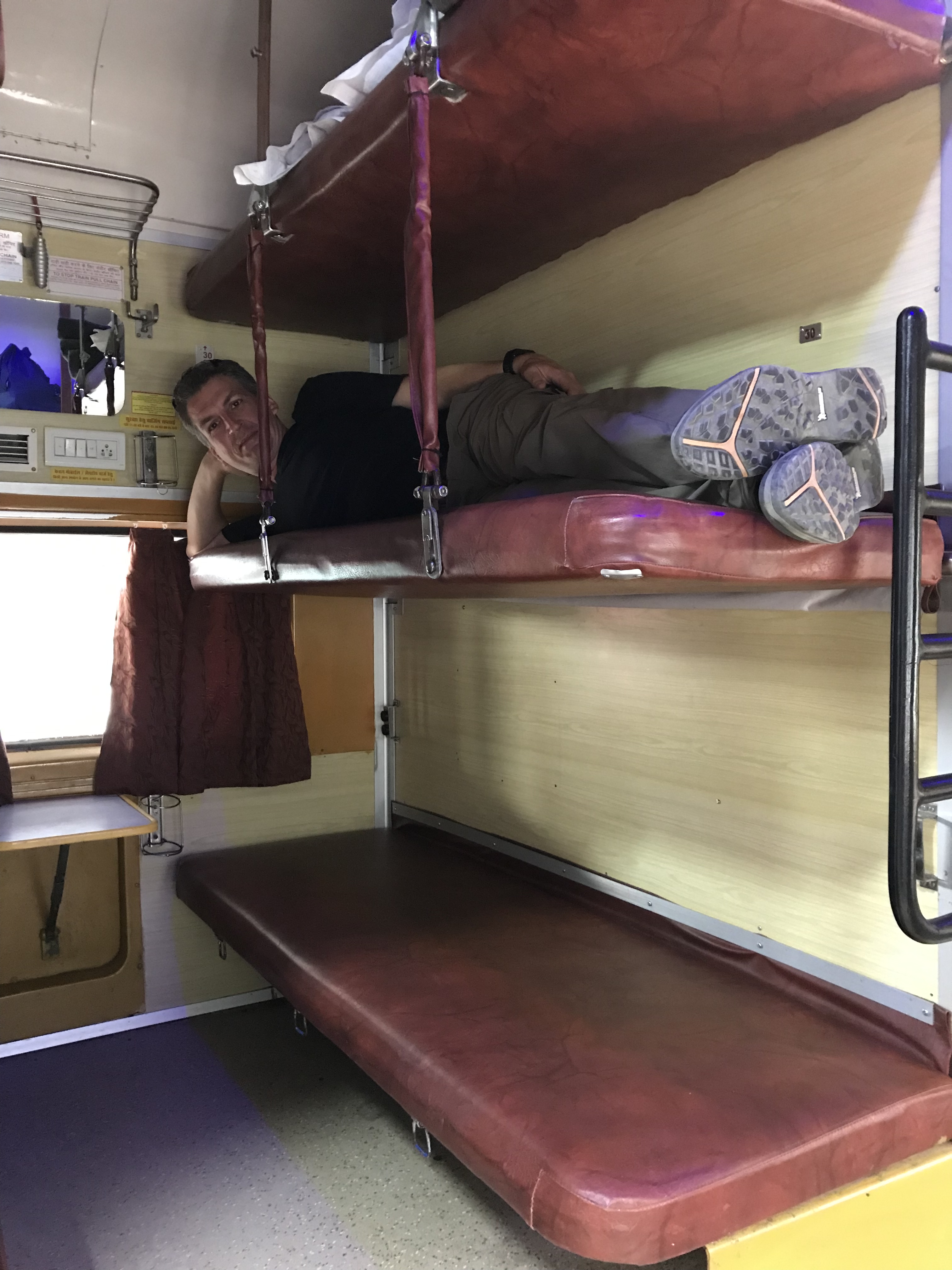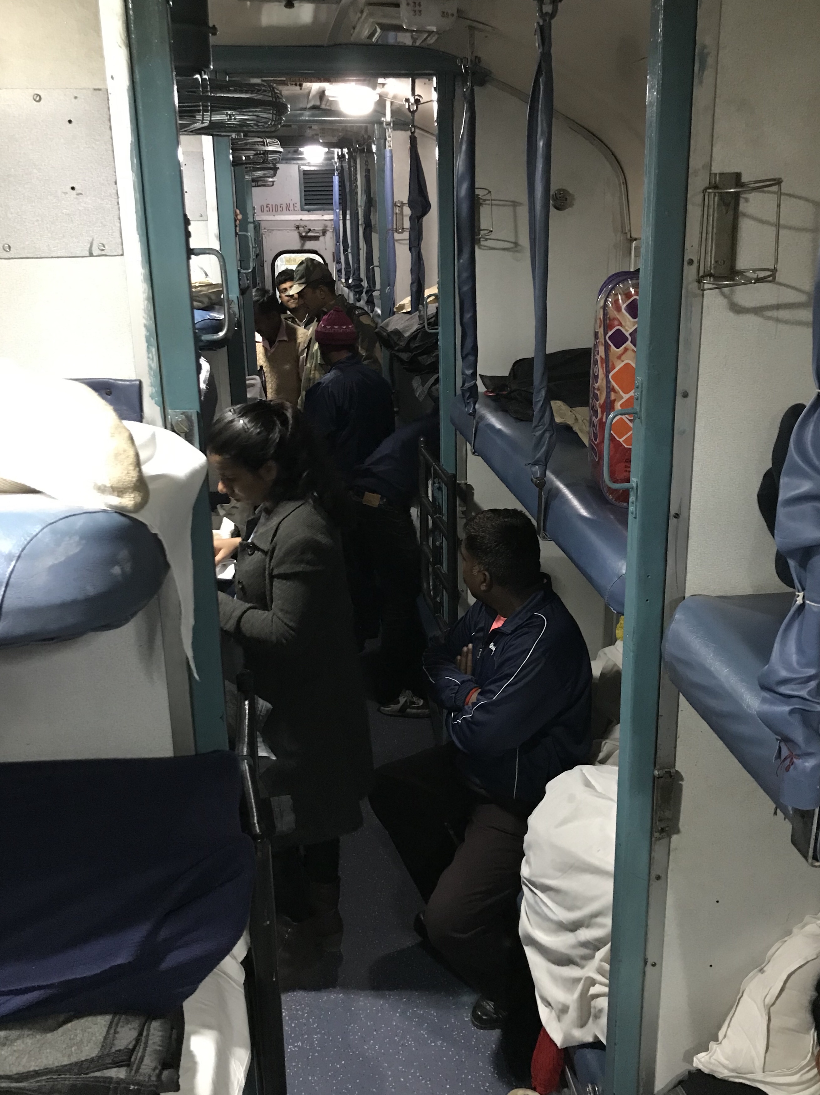 Sur cette note éditoriale, déplaçons nous maintenant à Pushkar, petite ville de pèlerinage. Pour nous y rendre, nous prendrons le train de nuit, à une heure du matin de Jaisalmer, pour arriver à Ajmer vers midi. Un taxi nous amènera ensuite à Puskar qui est à une quinzaine de km. Le train de nuit est une expérience beaucoup moins exotique que le bus de nuit. Nous avions pris des places dans un compartiment à 6 couchettes (2 séries de 3 superposées). Il faut savoir qu'il y a différentes classes et nous voulions l'expérience de l'indien moyen dans le contexte d'un long trajet. Mis à part le peu de place pour nos sac à dos, l’exiguïté de la couchette et la propreté toute relative des latrines (!) le trajet s'est bien fait. Encore une fois nous étions les seuls "blancs" dans le wagon, mis à part une italienne sympathique avec qui nous avons partagé le taxi pour Pushkar à l'arrivée.