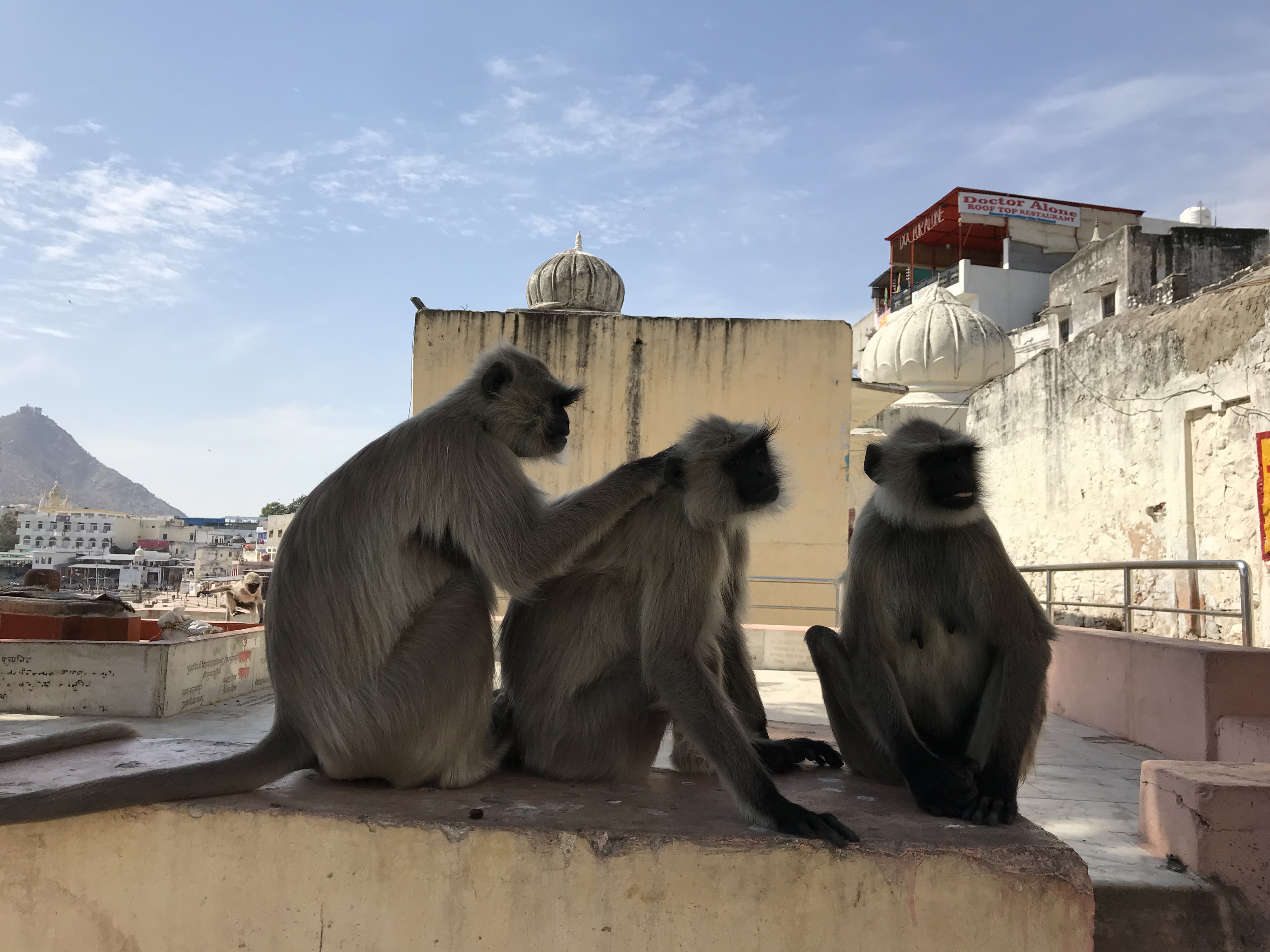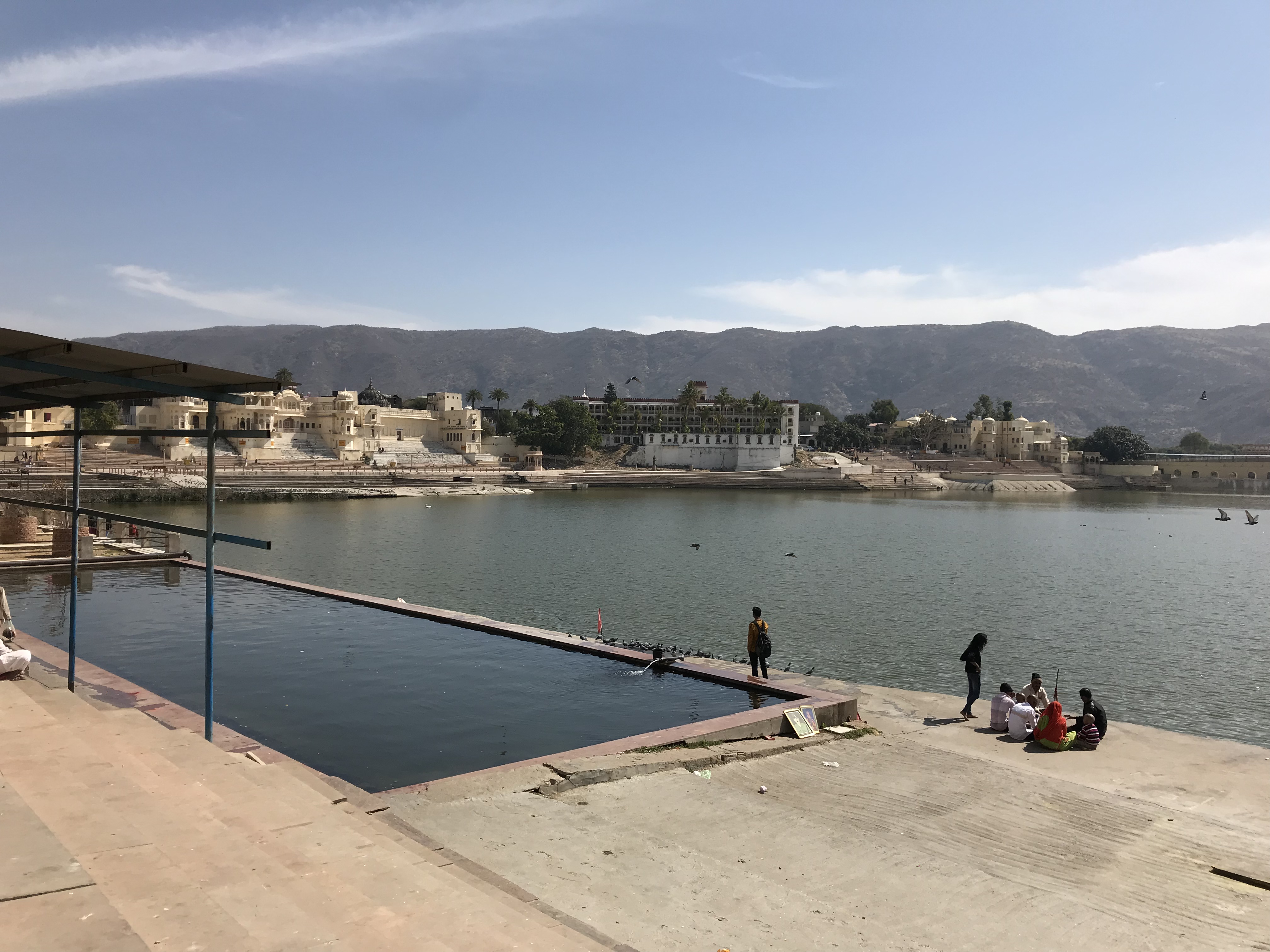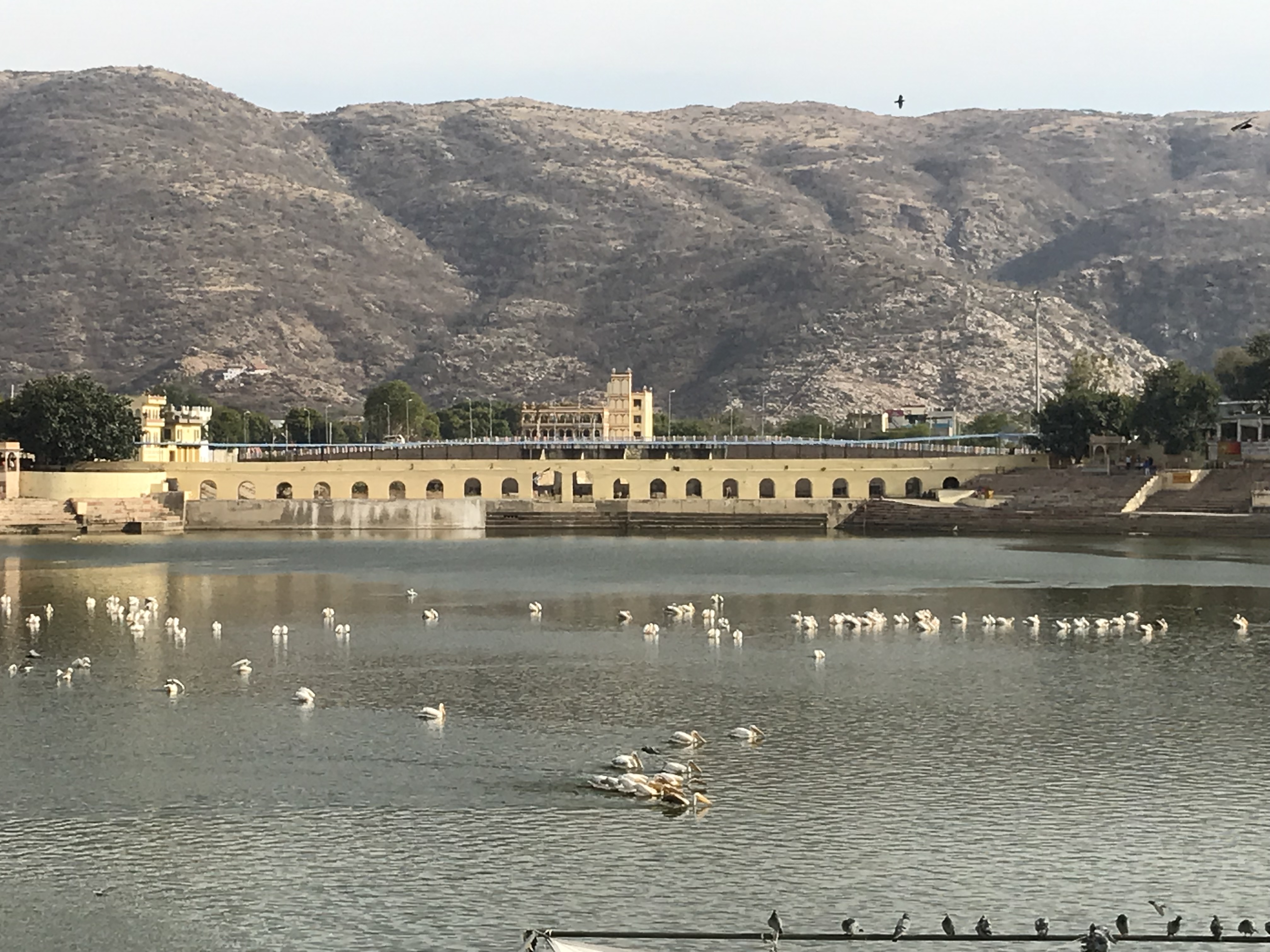 Pushkar est une petite ville enroulée autour d'un lac rempli de pélicans et qui est en fait un grand bassin où se versent d'innombrables escaliers descendant de "temples" délabrés où s'épouillent des singes.