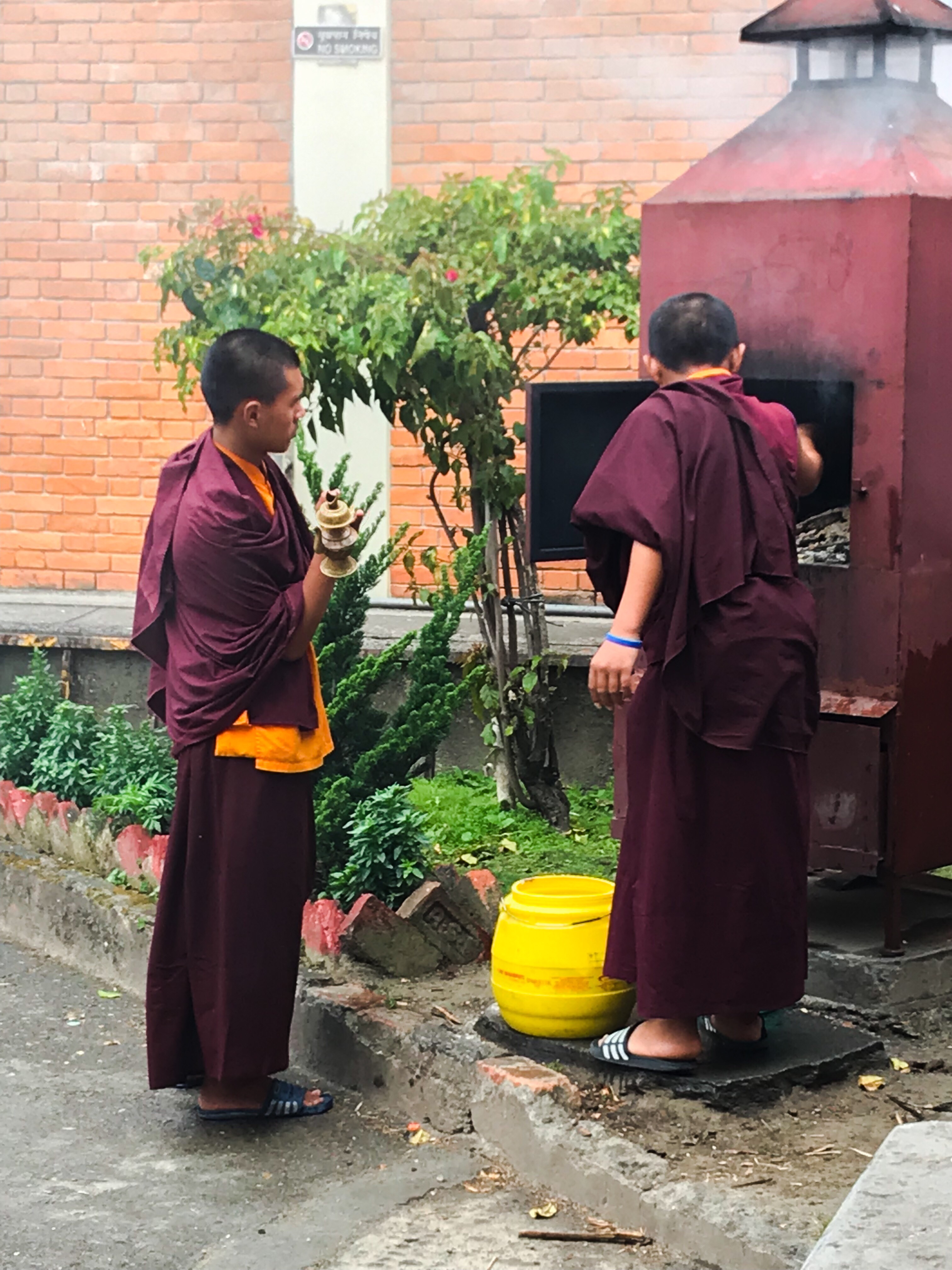 Mais le plus surprenant est qu'à travers ce rituel tout de même assez formel, d'autres moines entrent et sortent, transportant de grosses bouteilles de Fanta et de Coke, balaient soudainement le plancher puis passent la serpillière, roulent et retirent un tapis, le tout le plus naturellement du monde...