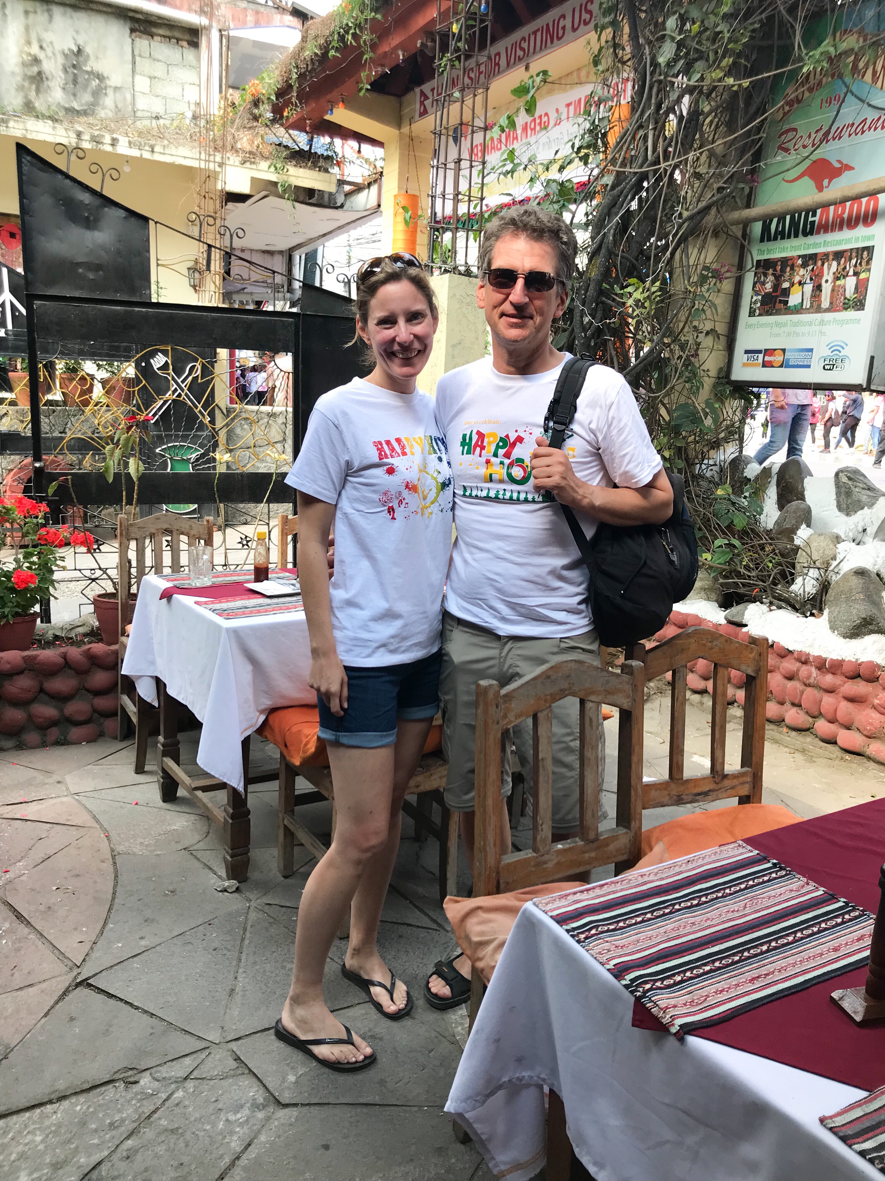 A l'instar des locaux et autres touristes, nous achetons et enfilons 2 t-shirts cheaps et nous engageons dans la foule joyeuse qui déambule le long de la rue principale. Devant certains bars s'agglutinent des petits groupes qui dansent au son de musiques variées (il y en a pour tous les goûts, du pop au folklore népalais, jusqu'au heavy metal).