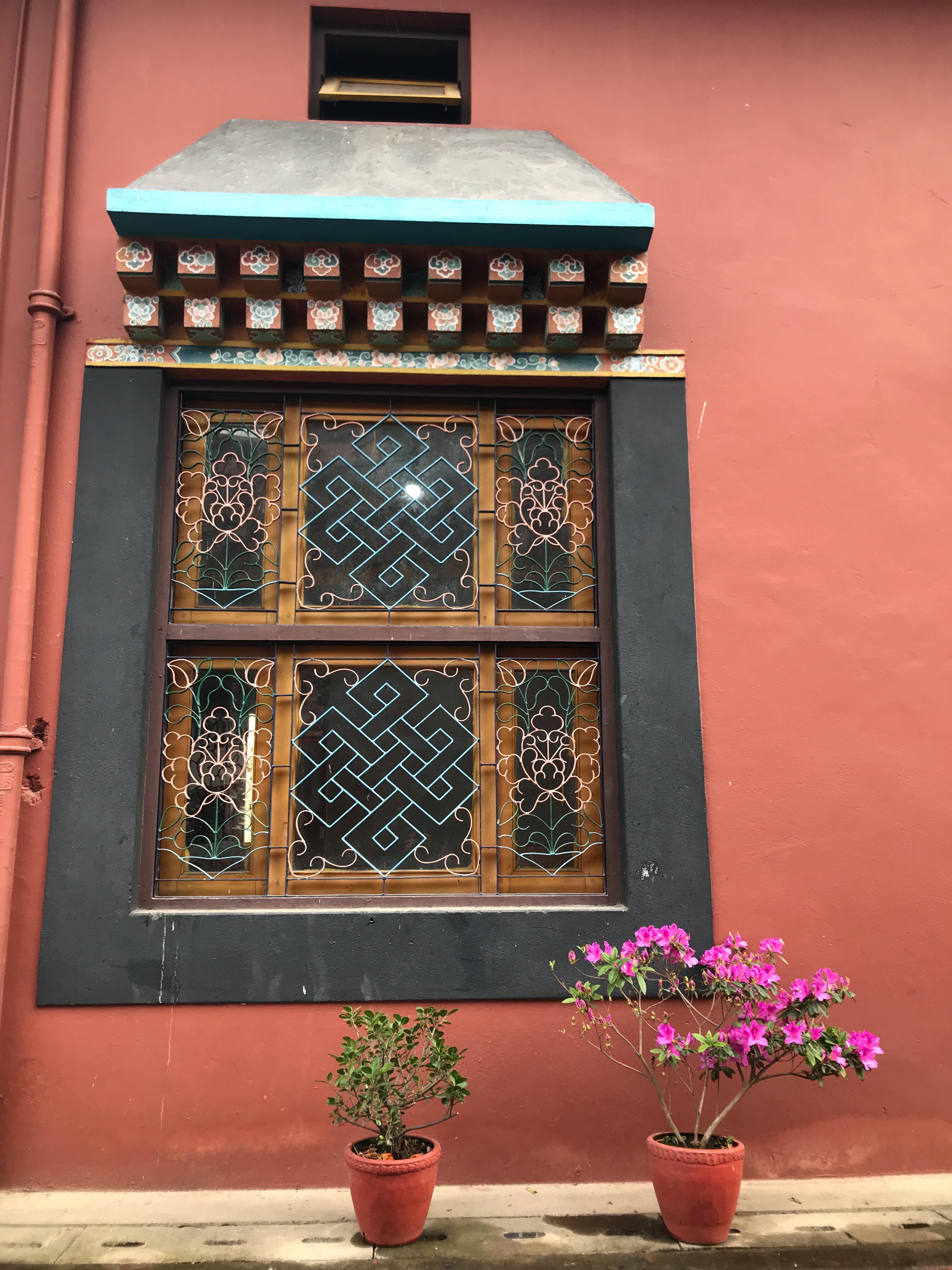 Nous sommes arrivés tout juste comme la cérémonie commençait. Un moine nous invite de la tête à entrer dans le temple et à nous asseoir contre un des murs extérieurs. Les moines sont assis en U au centre de l'espace devant de longs comptoirs sur lesquels reposent leurs livres de prières. Aux extrémités, deux jeunes moines battent le rythme sur de grands gongs. Essentiellement, les chants sont composés de longs couplets pendant lesquels les moines scandent des passages de leurs textes de façon, il nous semble, tous légèrement désynchronisés. Puis, certains moines sortent des instruments à vent et rejoignent les gongs dans un court segment un peu cacophonique mais étrangement harmonieux au final. Et le tout recommence, parfois sur un rythme un peu différent.