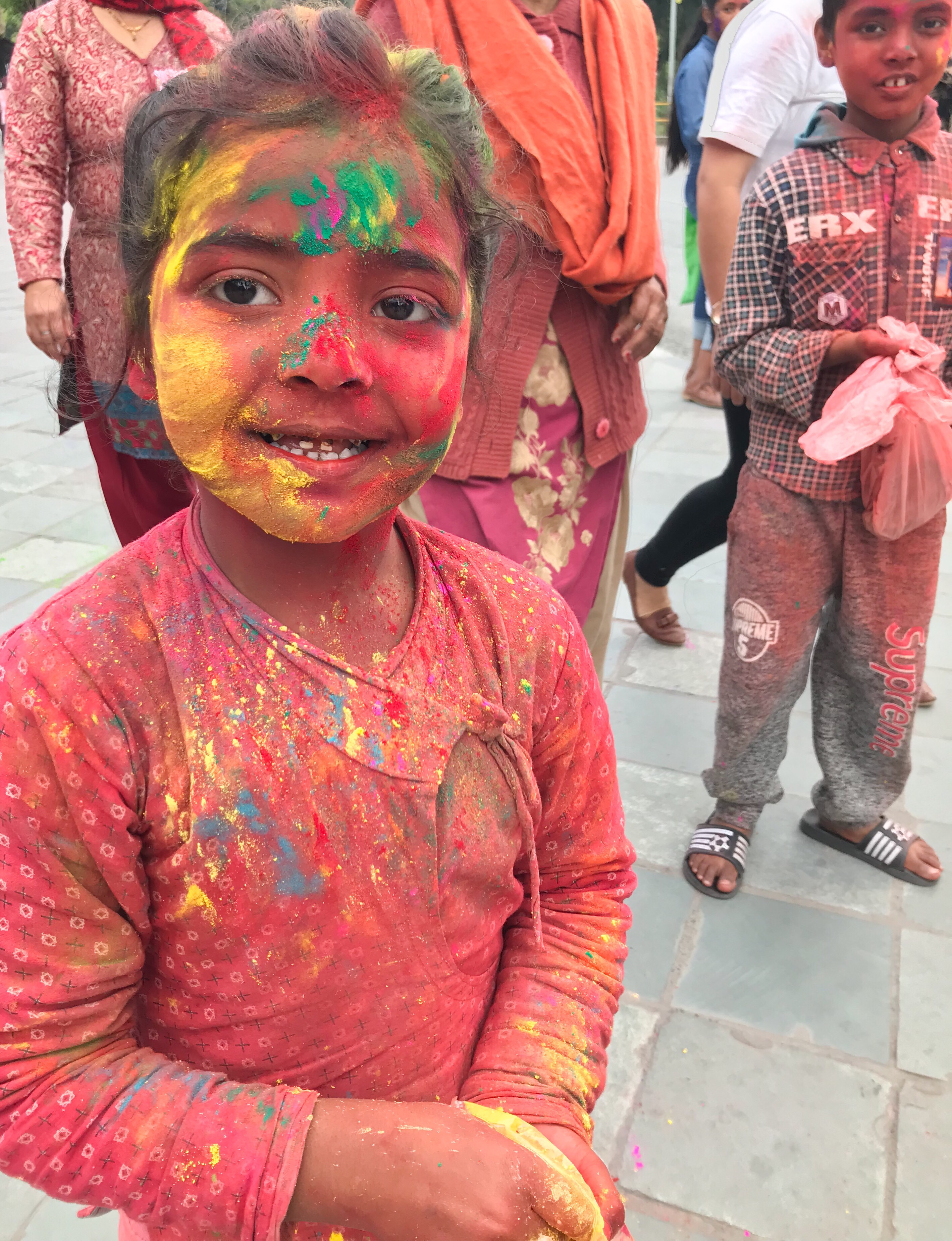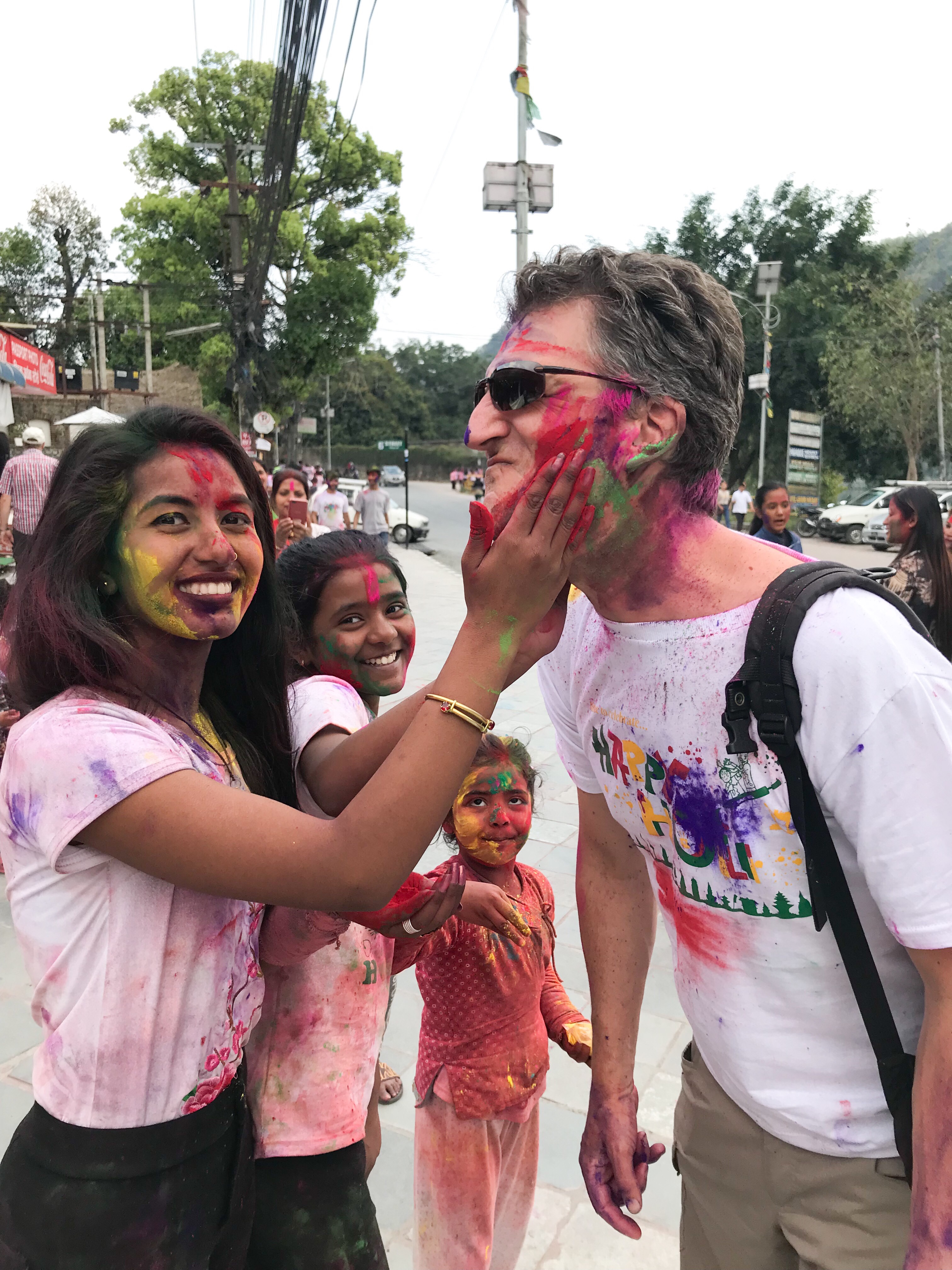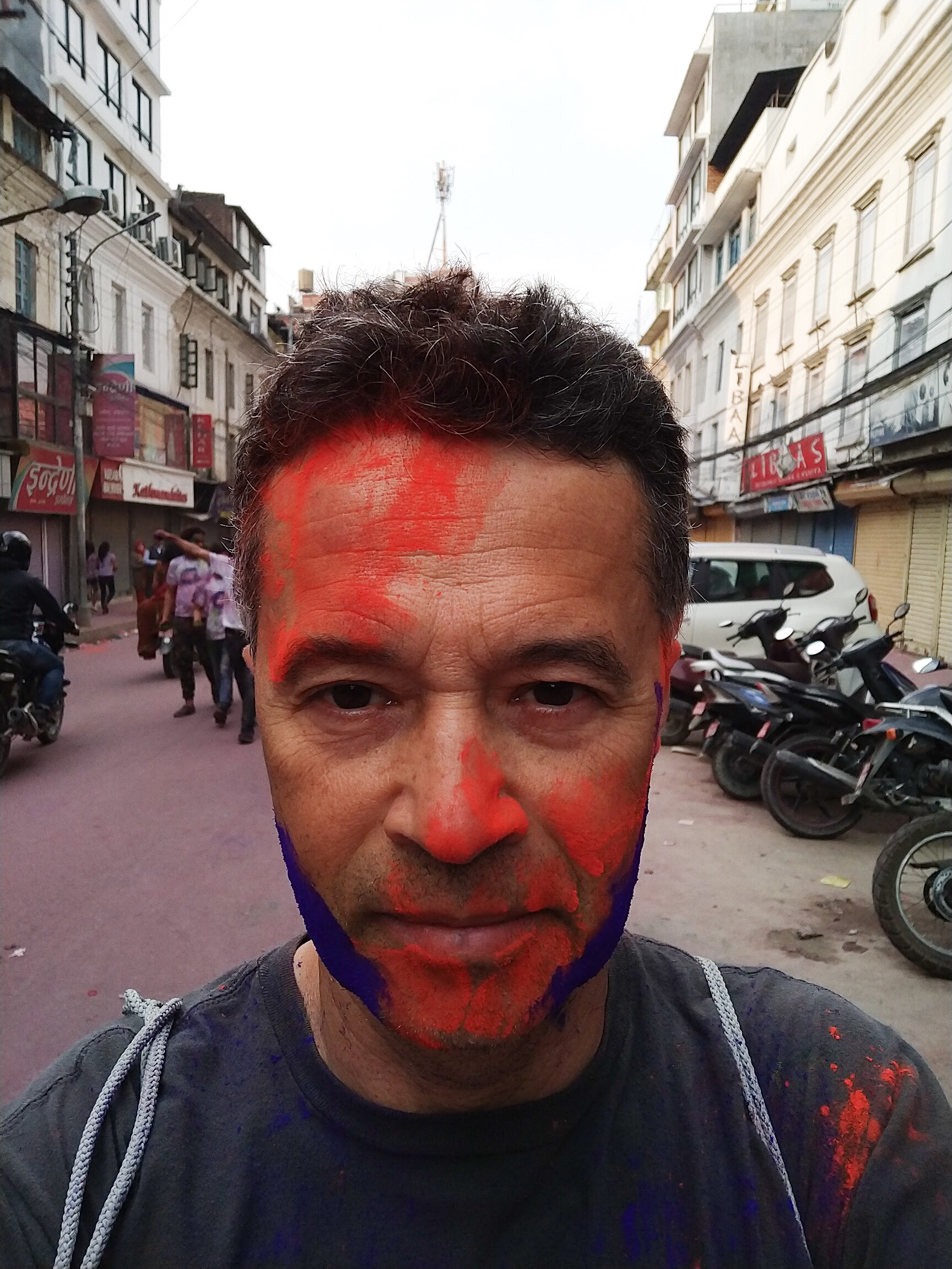 Au début, notre apparence immaculée retient sans doute les passants mais un premier groupe nous baptise et rapidement nous nous retrouvons bariolés et nous nous procurons aussi notre stock de poudre colorée pour passer en mode actif. Quelques jeunes appliquent parfois la poudre de façon un peu brusque mais globalement, le tout est plutôt respectueux et bon enfant, et l'ambiance est vraiment festive. Nous terminerons la fête sérieusement colorés!!! NOTE: Même Mauricio n'a pas été épargné à Katmandou...