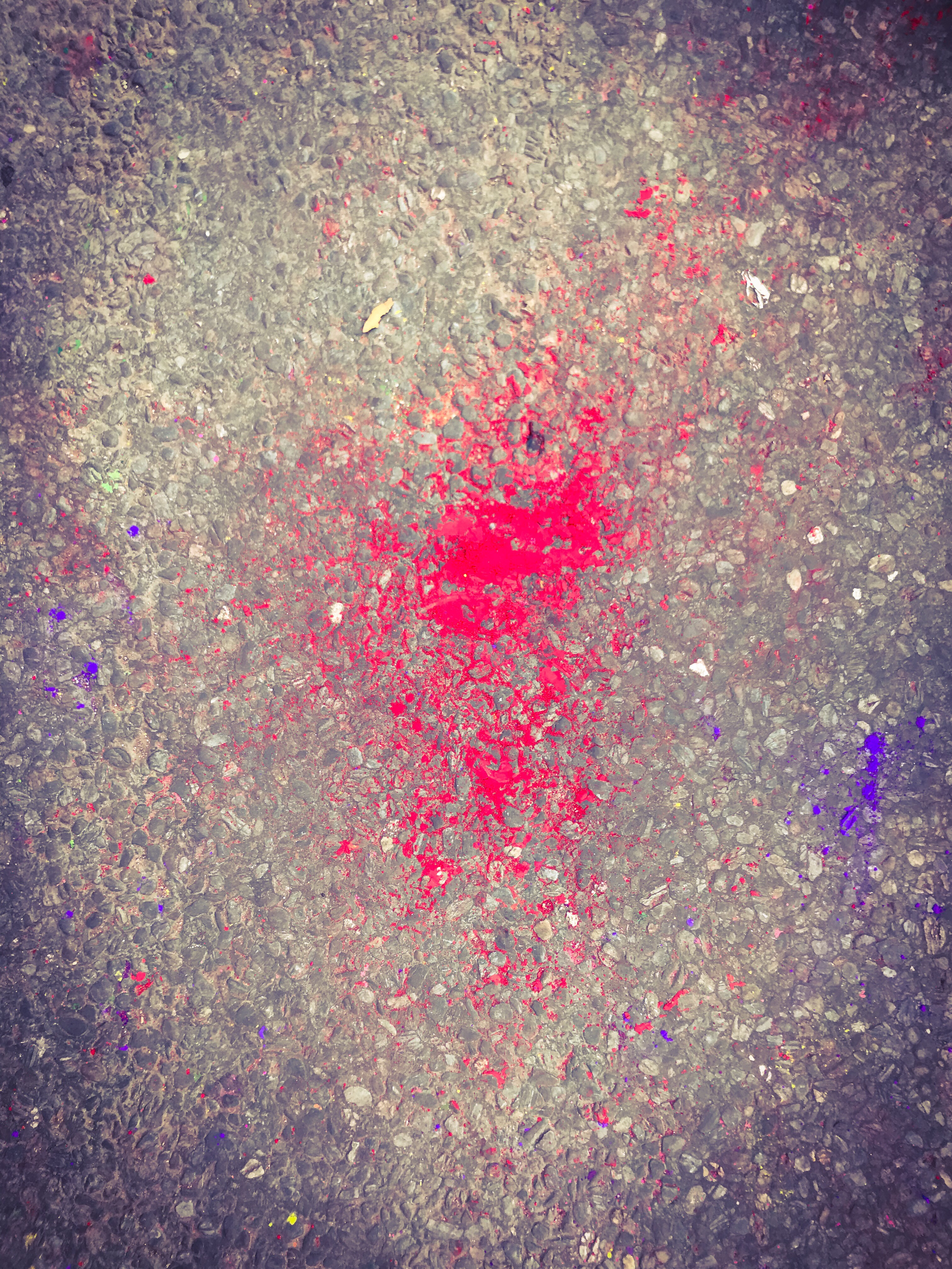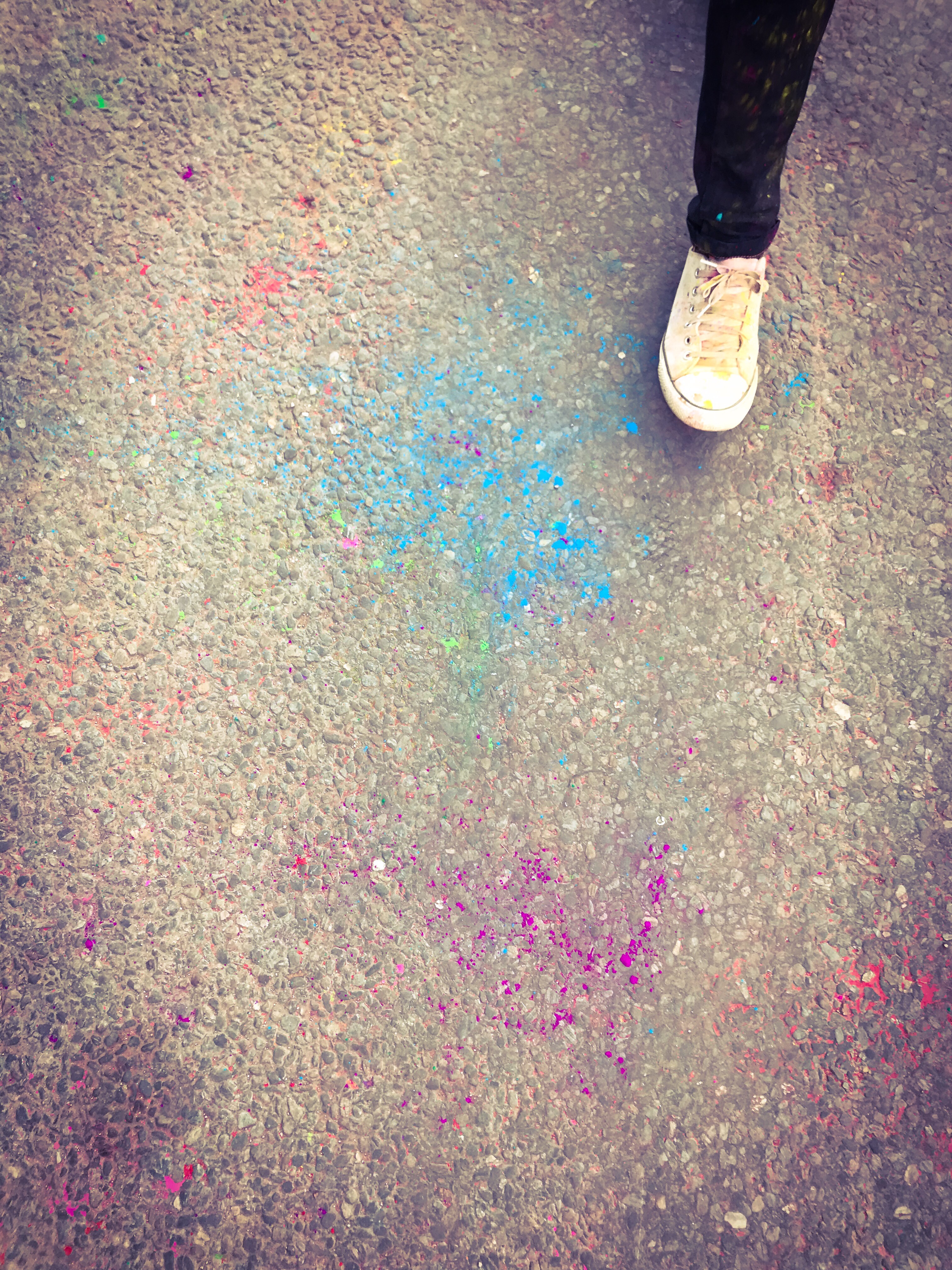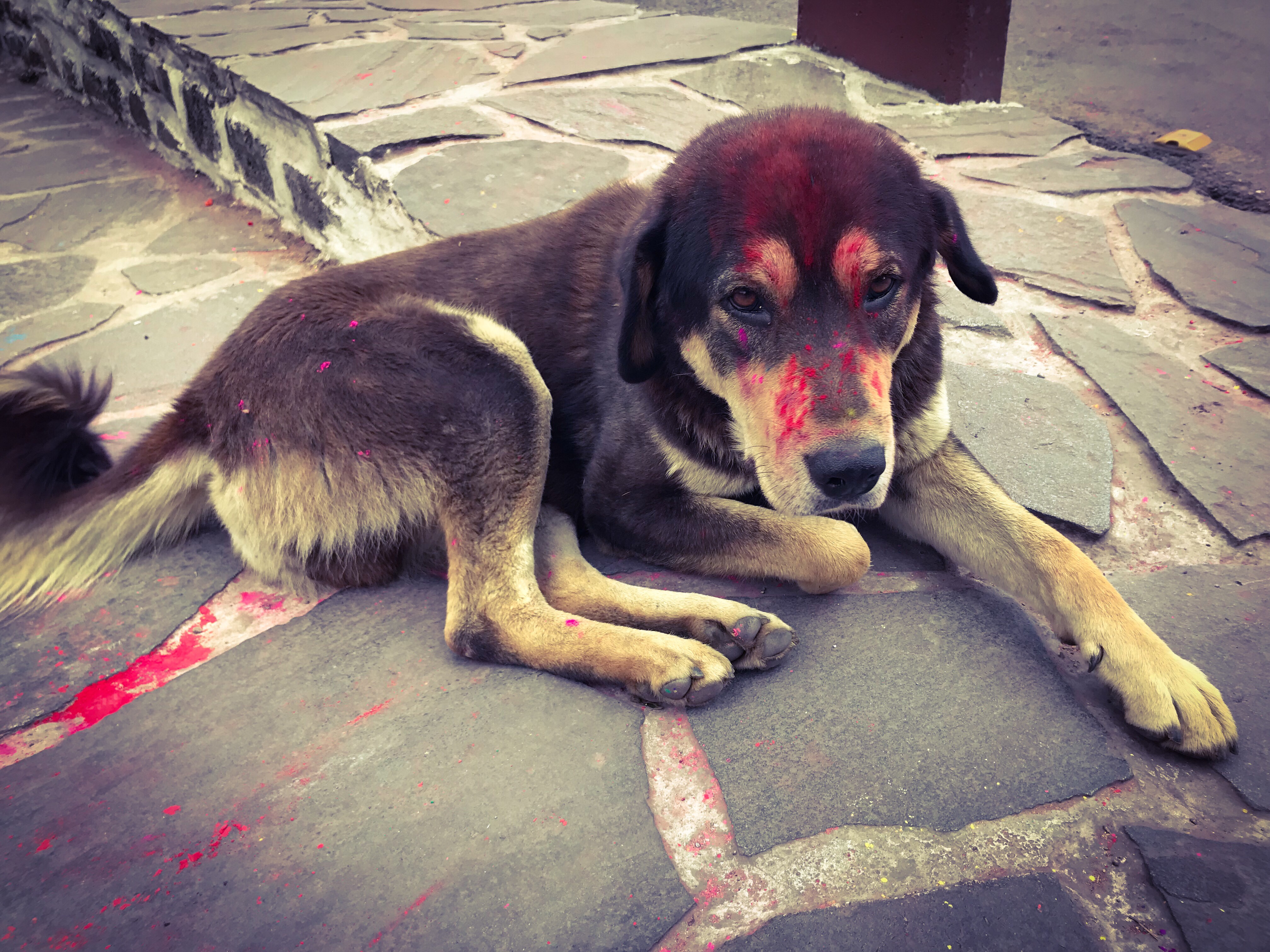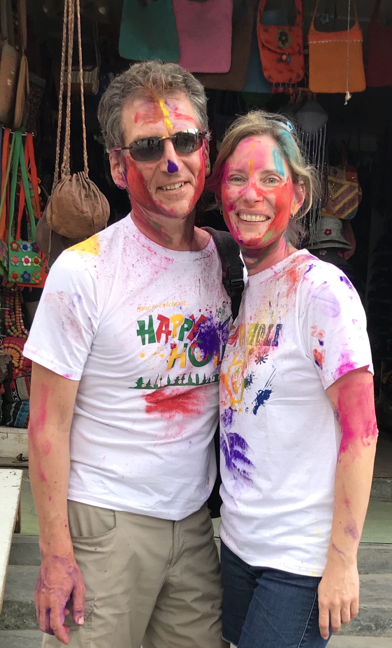 Au début, notre apparence immaculée retient sans doute les passants mais un premier groupe nous baptise et rapidement nous nous retrouvons bariolés et nous nous procurons aussi notre stock de poudre colorée pour passer en mode actif. Quelques jeunes appliquent parfois la poudre de façon un peu brusque mais globalement, le tout est plutôt respectueux et bon enfant, et l'ambiance est vraiment festive. Nous terminerons la fête sérieusement colorés!!! NOTE: Même Mauricio n'a pas été épargné à Katmandou...
