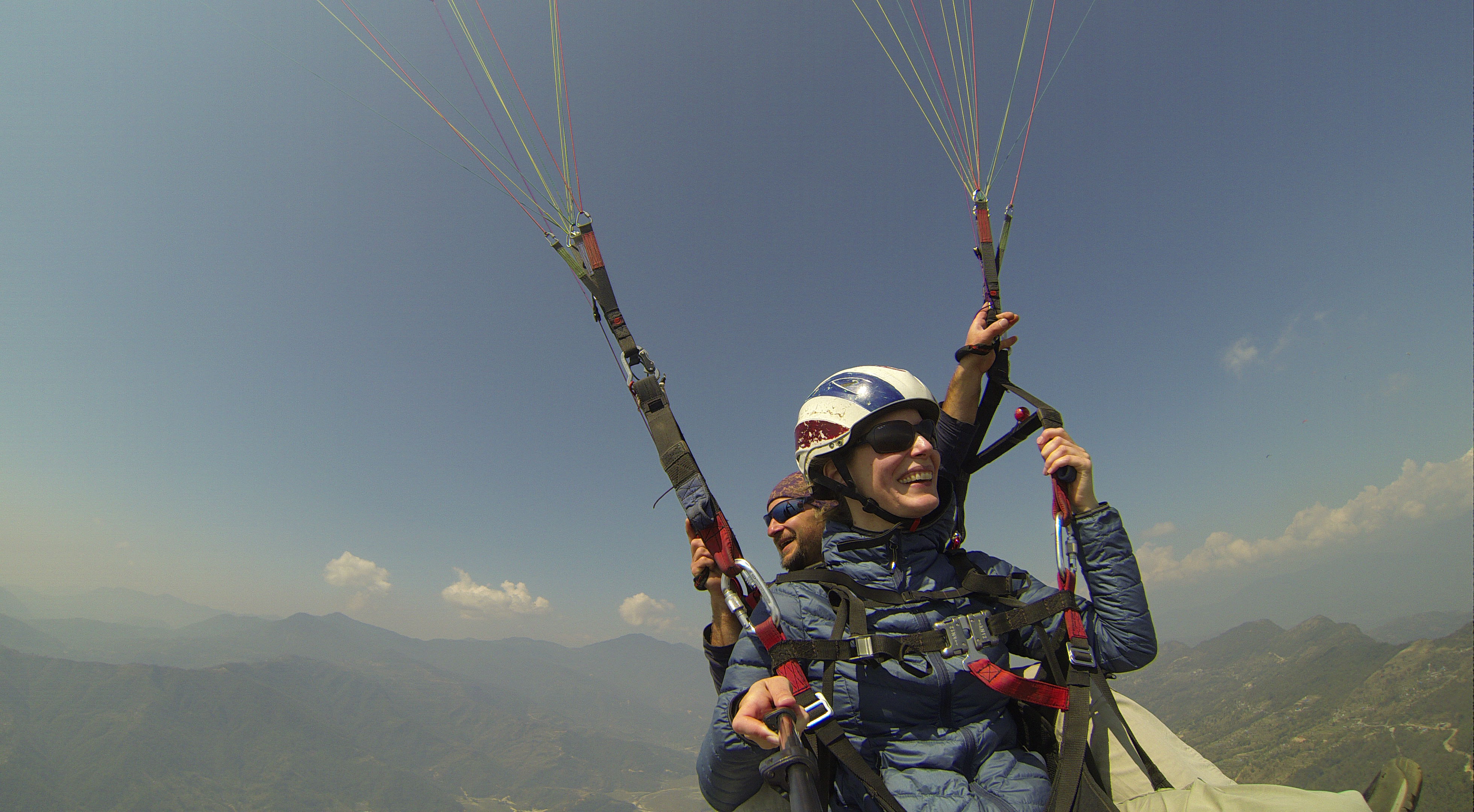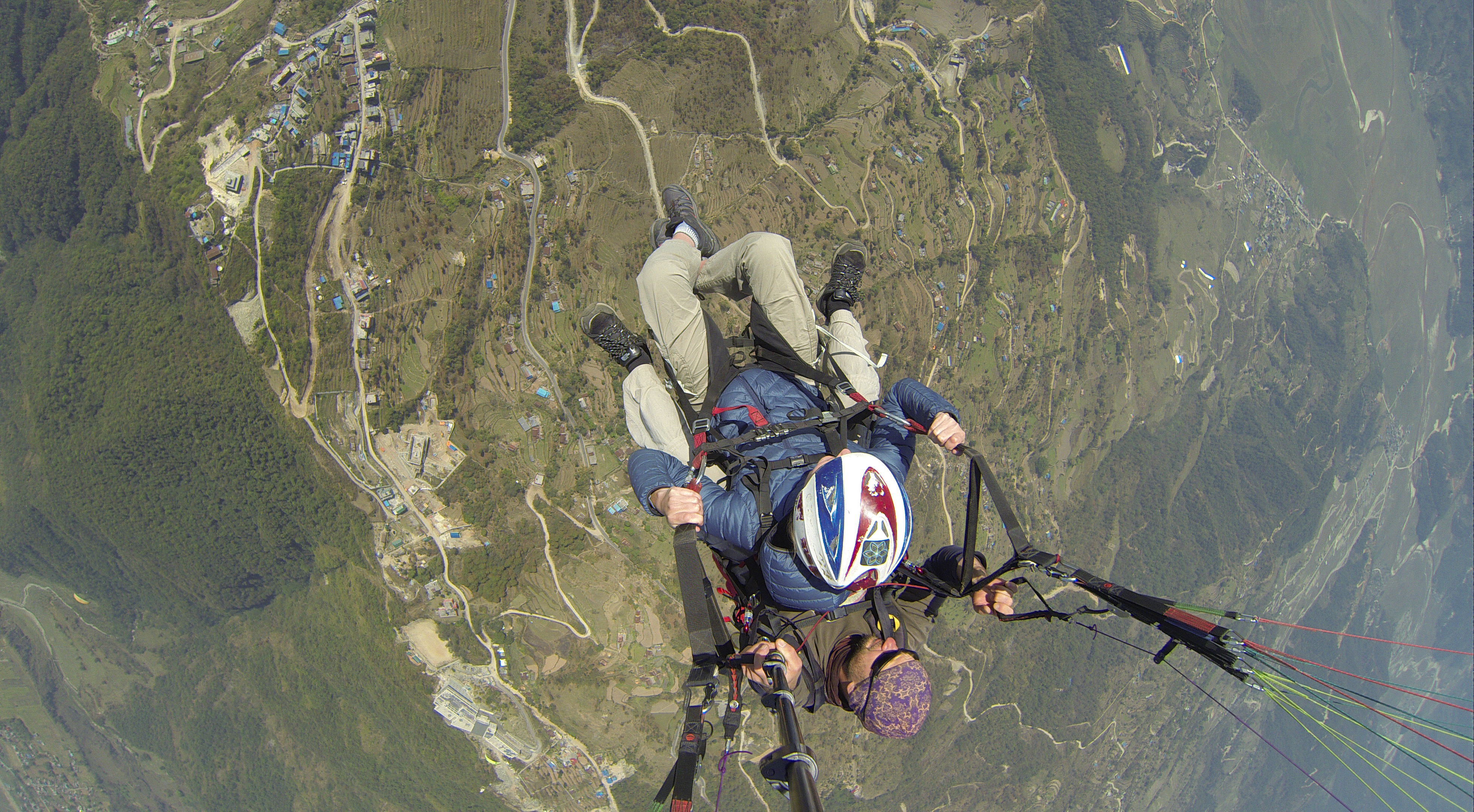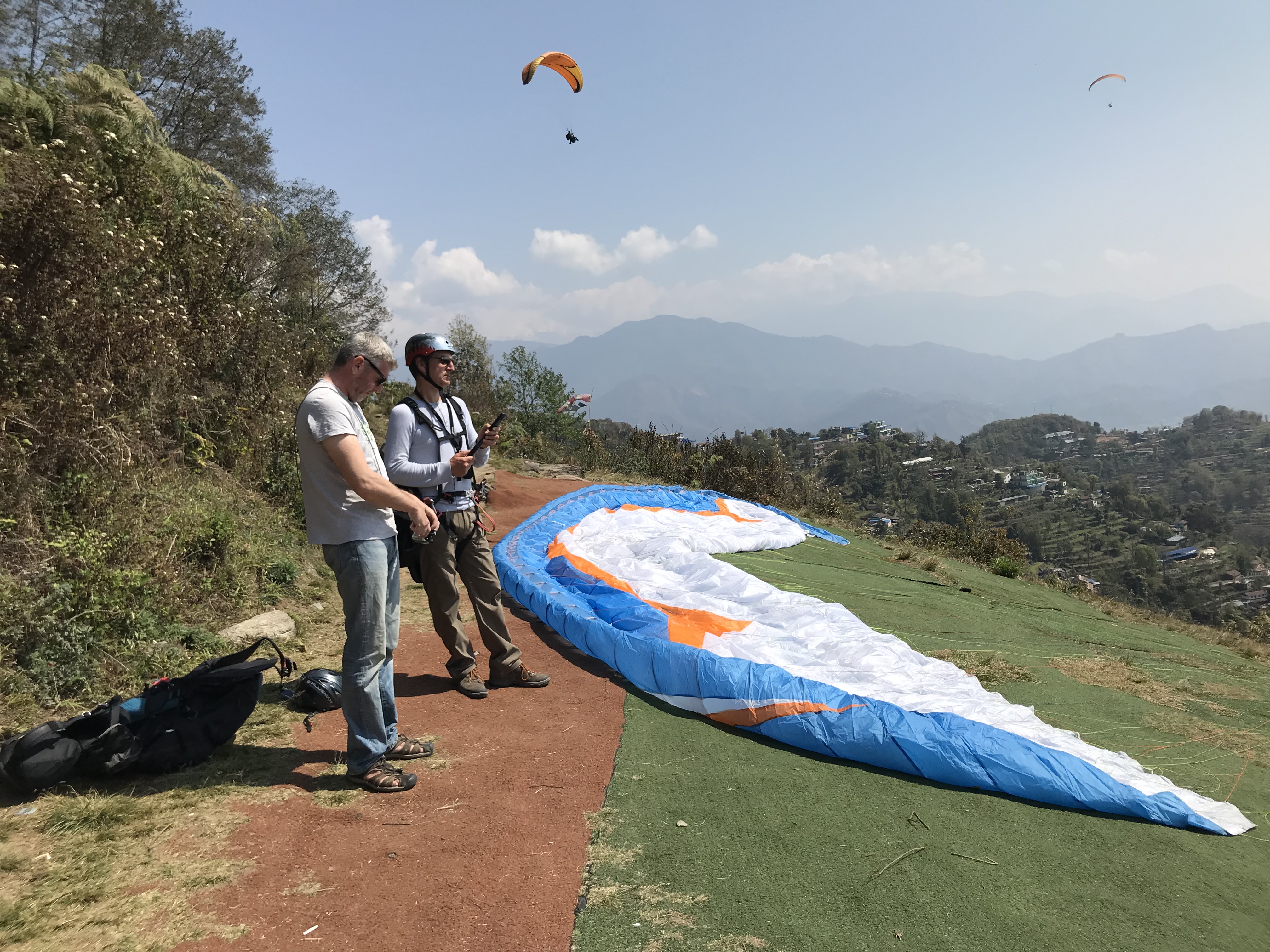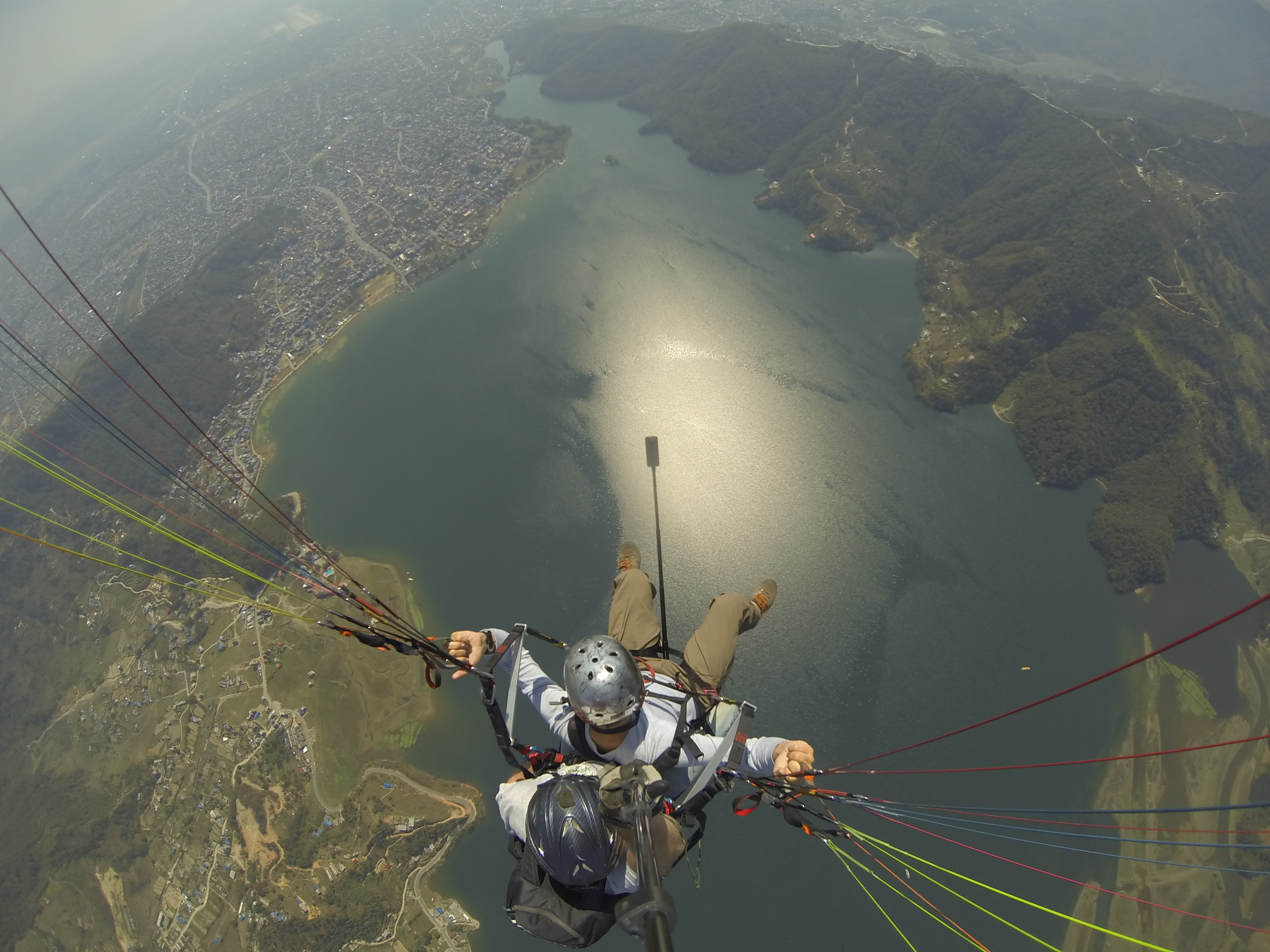 Nos deux décollages se font sans histoire et nous nous retrouvons, flottant légèrement dans le ciel de Pokhara, sans bruit, et entreprenons de grands virages pour profiter des colonnes d'air ascendant afin de prendre de l'altitude.