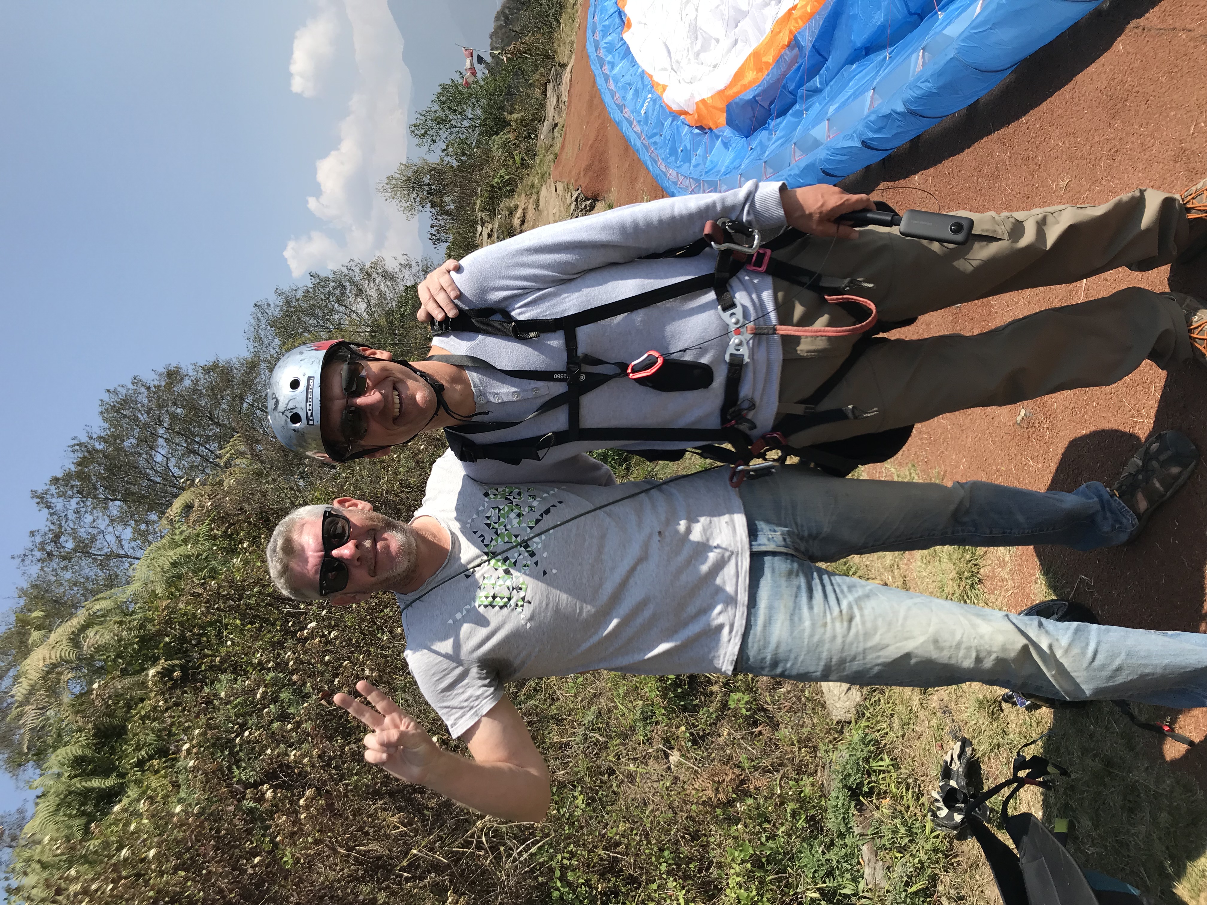 Le lendemain matin, après avoir déjeuné avec Mauricio qui prenait le bus pour Katmandou et versé quelques larmes (en fait, nous voulions être certains de le voir prendre le bus 😜), nous quittons pour notre séance de parapente.