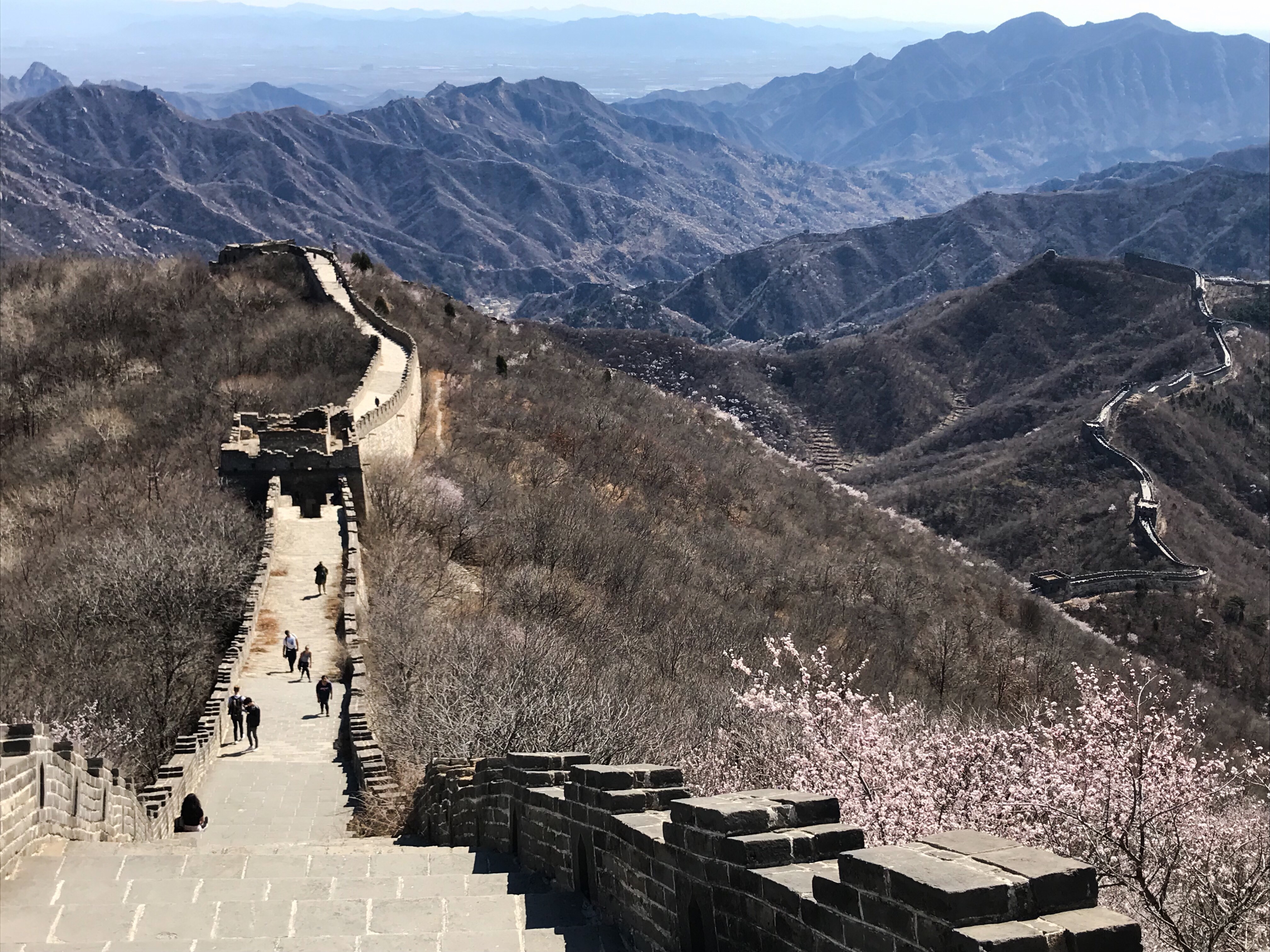 Nous avons aussi pris une journée pour quitter la ville et nous rendre à l'un des sites valorisant la fameuse muraille de Chine. Et dans ce cas, pas de déception, l'oeuvre colossale est aussi impressionnante que nous l'anticipions. Et nous avons eu droit en prime aux cerisiers en fleurs qui ornaient les flancs des valons entourant la muraille... grandiose!
