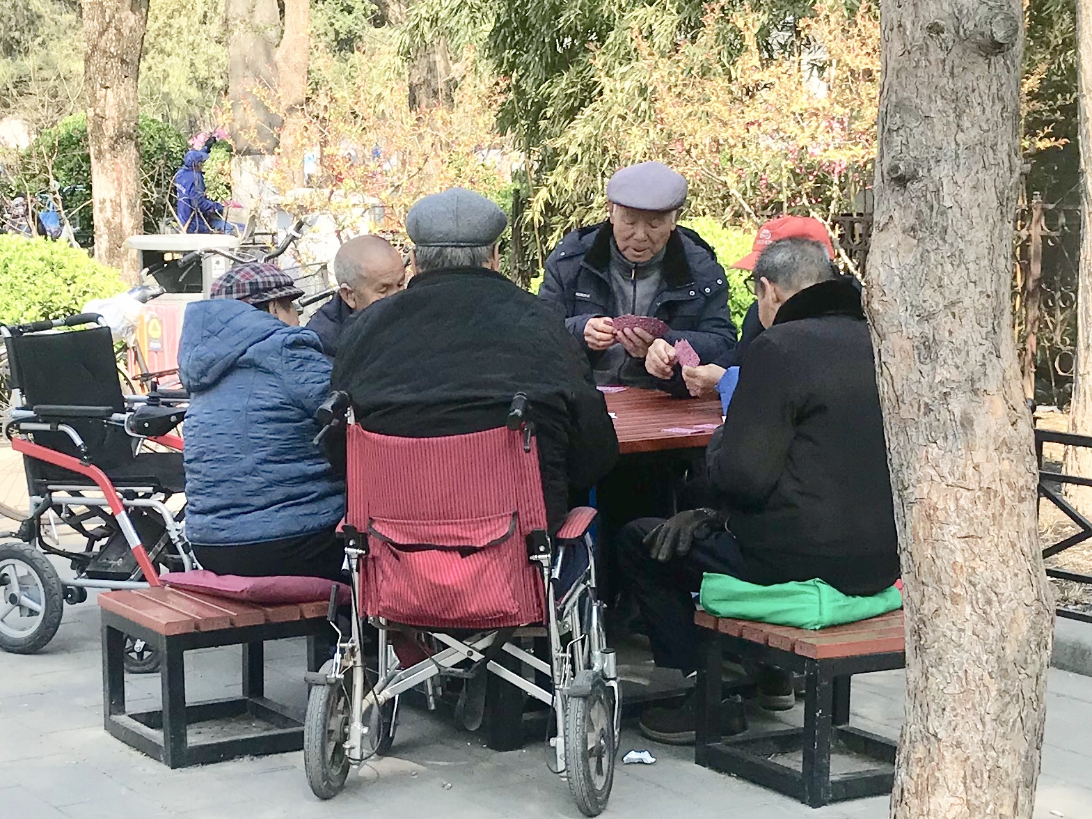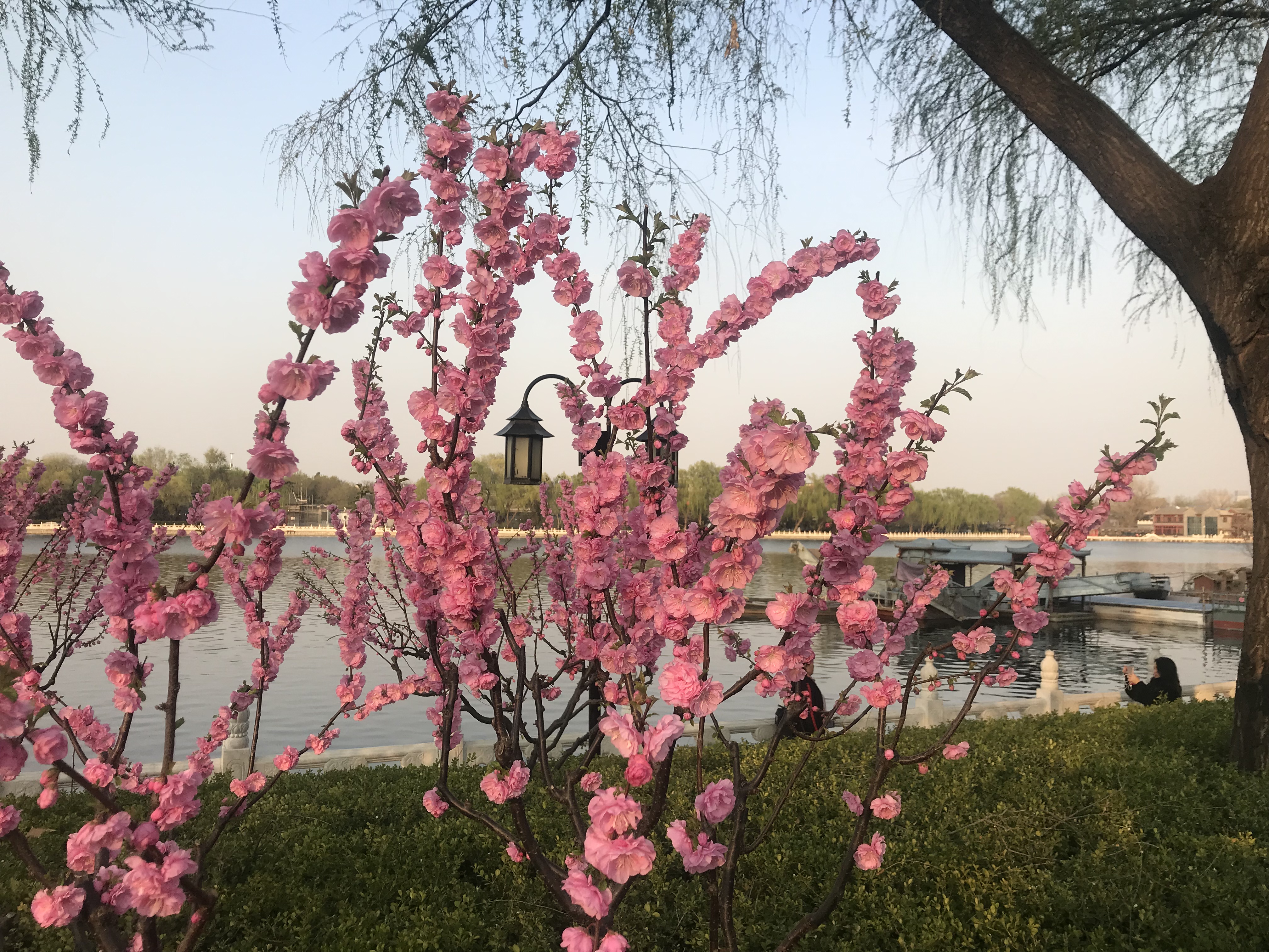 Non loin, un lac (qui est plutôt un très grand étang) est entouré de magnifiques saules pleureurs et nous avons la chance d'arriver comme les cerisiers commencent à fleurir. Le paysage est magnifique et il est très agréable de déambuler parmi les chinois qui profitent aussi de ce printemps tardif et qui jouent au mah-jong et à d'autres jeux de hasards sur les rives du lac et dans les parcs.