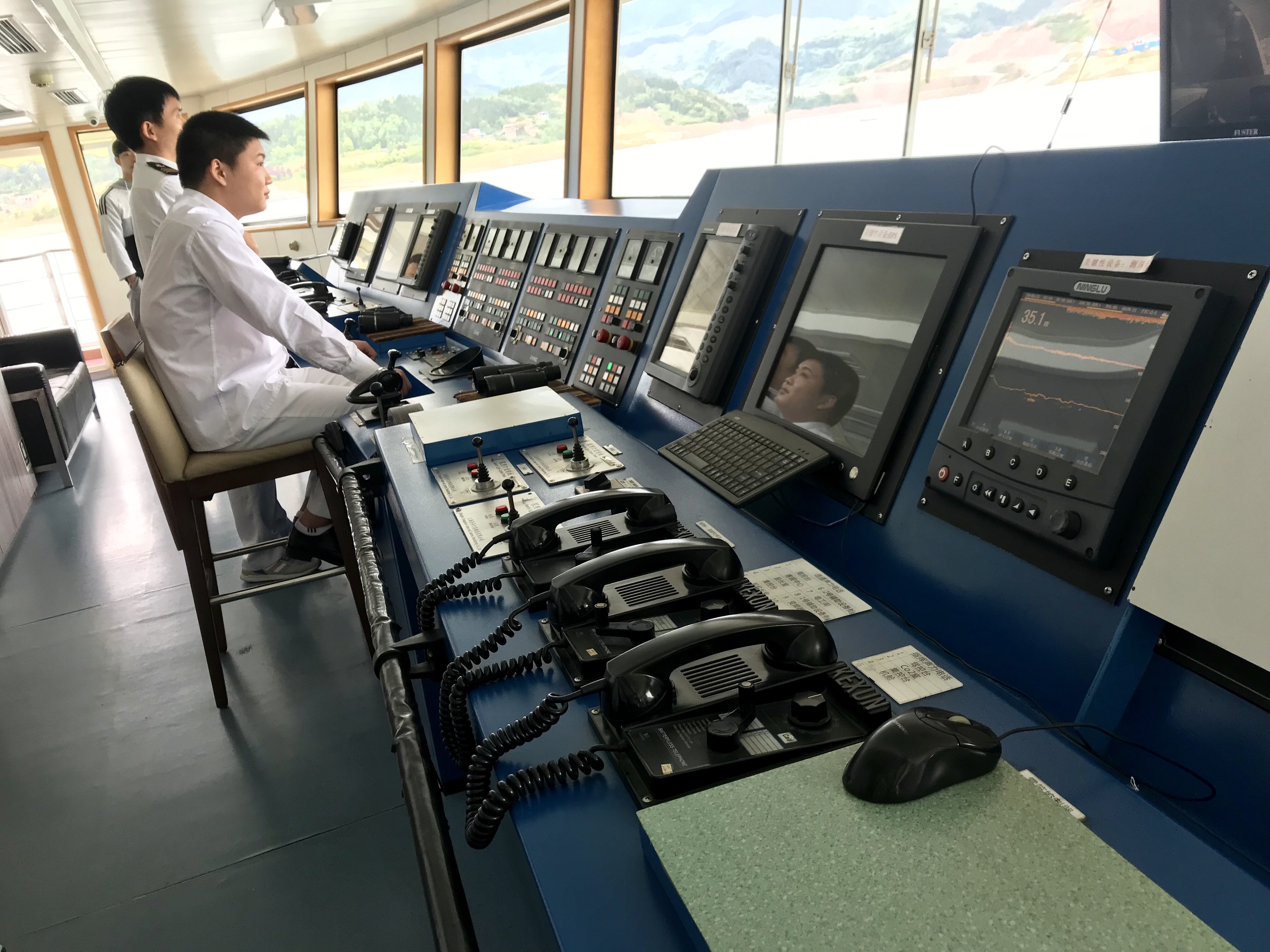 Notre bateau de croisière pouvait accueillir près de 400 personnes et nous étions environ 350 pour notre séjour dont 90% étaient chinois. Notre trajet nous amenait de Chongqing à Yichang pour un parcours de quelque 600 km sur le célèbre fleuve. Nous avons été étonnés par le confort et le silence du navire qui pouvait quitter son point d’amarrage sans même que nous nous en apercevions.