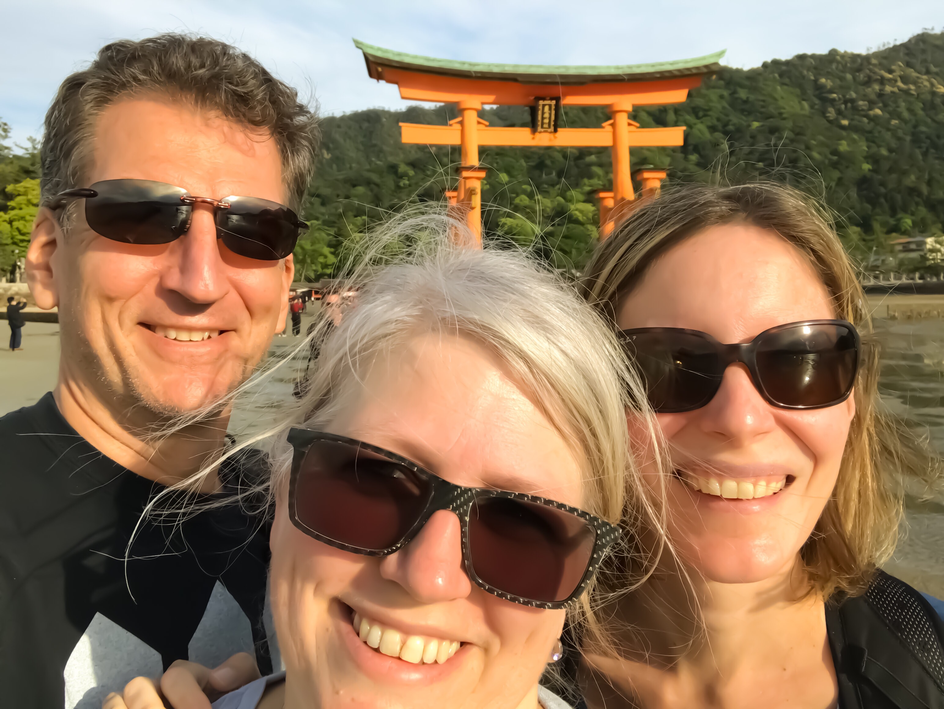 Le lendemain, avec Geneviève, nous nous sommes dirigés en bateau vers Miyajima, petit village de l'île d'Itsuku, considérée comme l'un des trois plus beaux sites du Japon. En arrivant à Miyajima, un temple sur pilotis est gardé par une immense arche ("torii") qui se trouve sur la grève à marée base, et dans l'eau à marée haute.