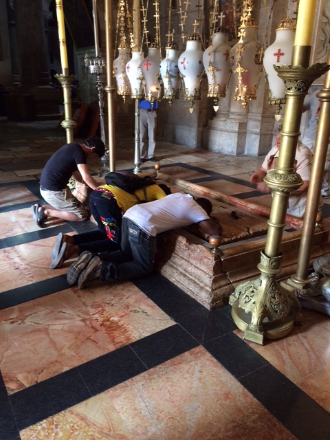 Après la visite, nous revenons à l’Église du Saint-Sépulcre qui est encore relativement vide mais qui s’est remplie très rapidement de groupes de toutes provenances. Certains sont des pèlerins qui embrassent intensément la pierre sur laquelle Jésus aurait été étendu après sa crucifixion. L’église est partagée par 4 ou 5 ordres religieux qui ne peuvent s’entendre sur la gestion des lieux au point où c’est une famille musulmane qui s’en est vu confier les clés et qui ouvre et ferme les lieux à chaque jour. Allez comprendre…