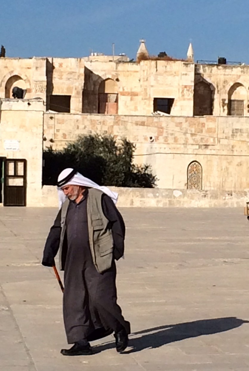 Aujourd’hui, dimanche, nous avons réservé à 9h pour la visite du tunnel Kotel qui longe le mur occidental. Mais en arrivant un peu à l’avance sur la place, nous constatons que la passerelle pour l’Esplanade des mosquées est ouverte et que personne ne s’y aventure… Au point de contrôle, on fouille nos sacs, comme c’est la norme, et nous réalisons que nous entrons en terre musulmane quand le garde sort la kipa de François en s’exclamant « Are you jewish? ». Annie répond instantanément « No, no, no !». La kipa restera au point de contrôle mais nous passons…