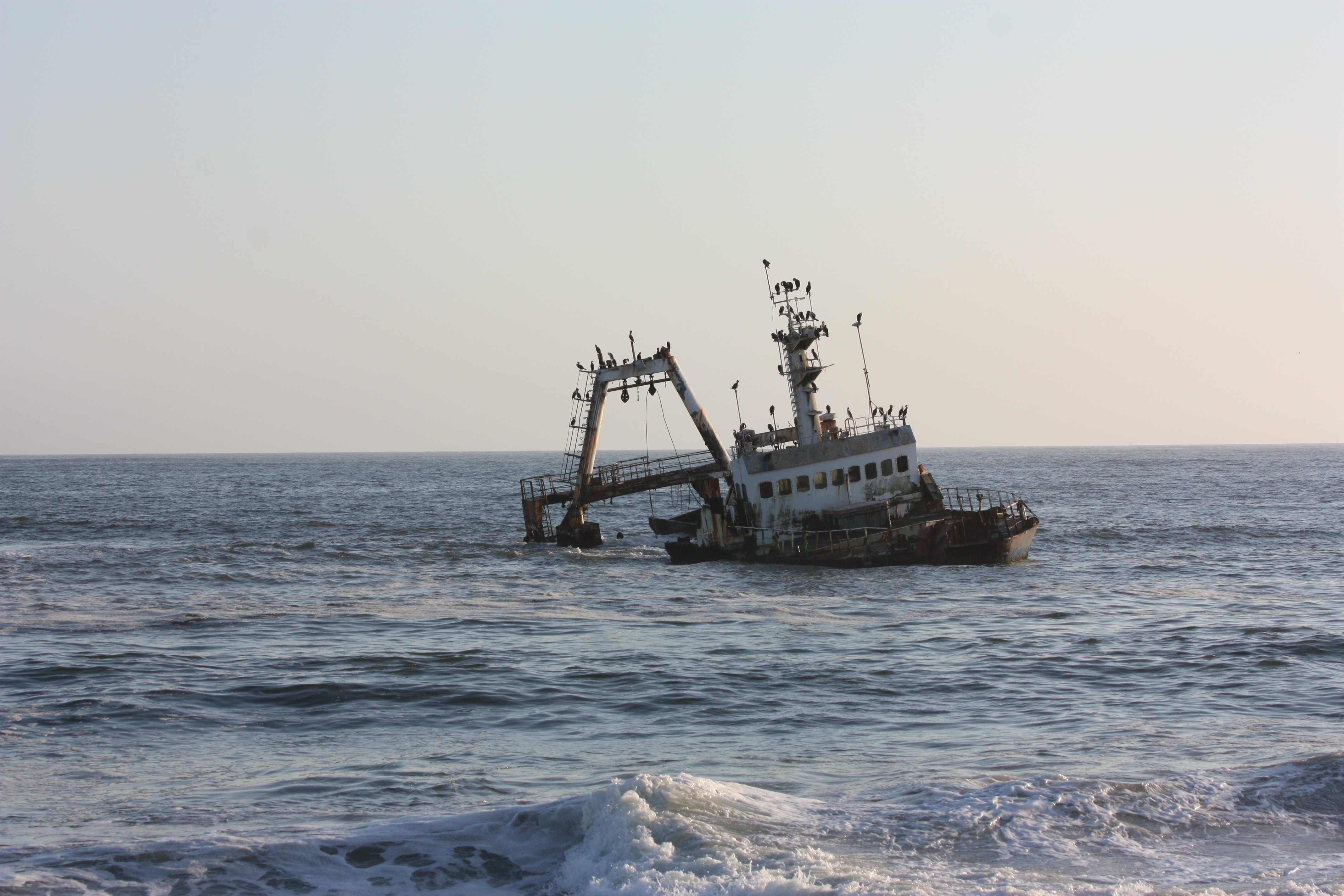 Sur cette route, en une journée, nous serons passés d’un environnement sec mais quand même assez feuillu à une zone montagneuse rappelant l’Arizona pour arriver dans une immense plaine conduisant à la mer, à ses dunes et à la fameuse Skeleton Coast. Cette zone côtière particulièrement hostile aux navires héberge de nombreuses épaves et même les squelettes de baleines qui s’y échouent, d’où son nom. Le brouillard qui la baigne le matin et souvent pendant une parte de la journée vient ajouter à son côté mystérieux. La route qui la longe est sur une grande partie composée de sel compacté.