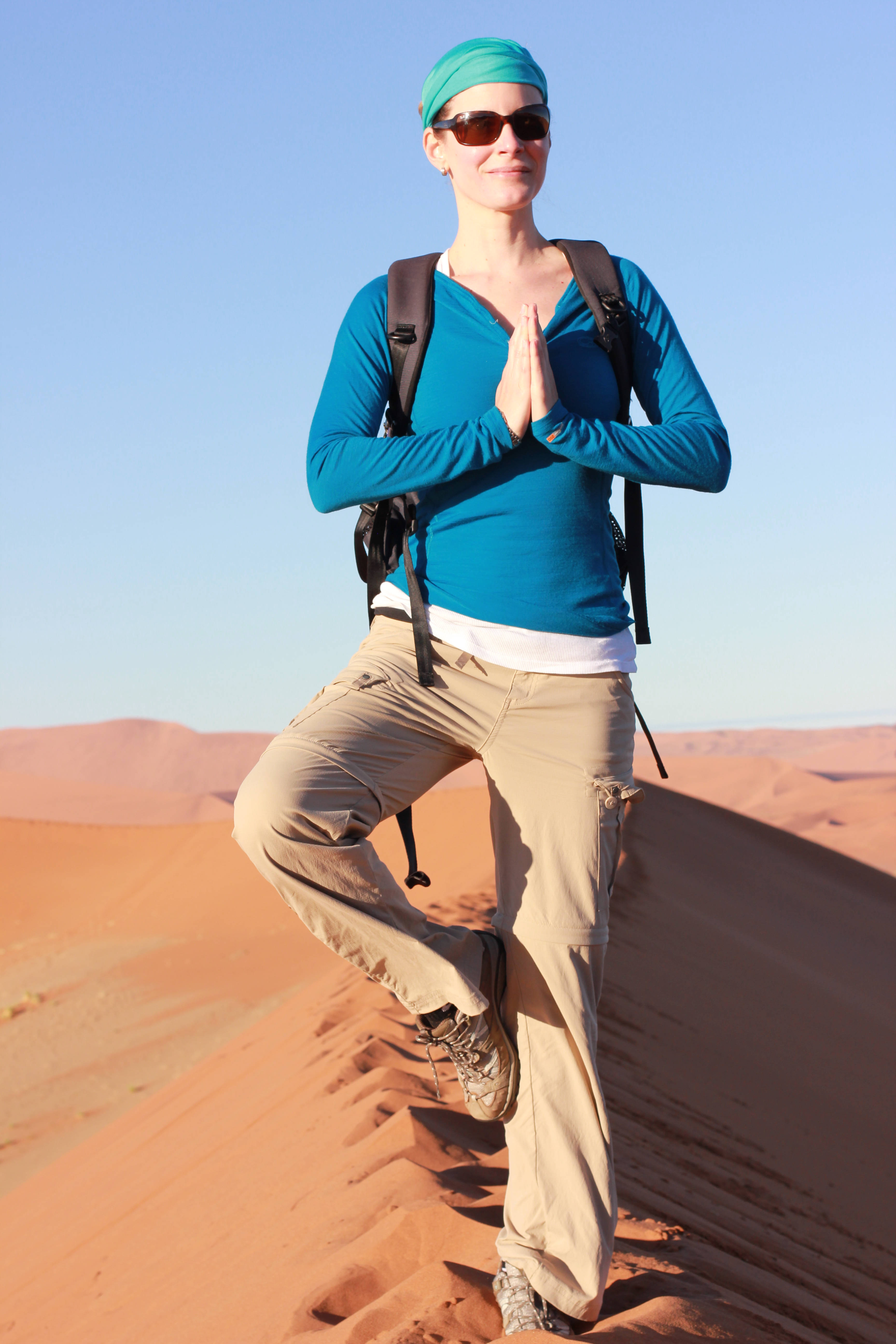 Pour en revenir à Sesriem, nous y avons donc établi notre campement pour 3 nuits et dès la première journée, nous nous sommes engagés sur la route de 60km qui traverse la vallée bordée de dunes. Au Km 45, la « dune 45 » s’avance presque jusqu’à la route et permet une ascension relativement aisée. En la grimpant en fin de journée, nous avons eu une vue splendide sur les dunes de l’autre côté de la vallée qui offraient leurs flancs au soleil couchant.